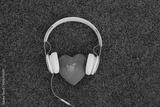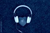 stone hearts with headphones on grass background