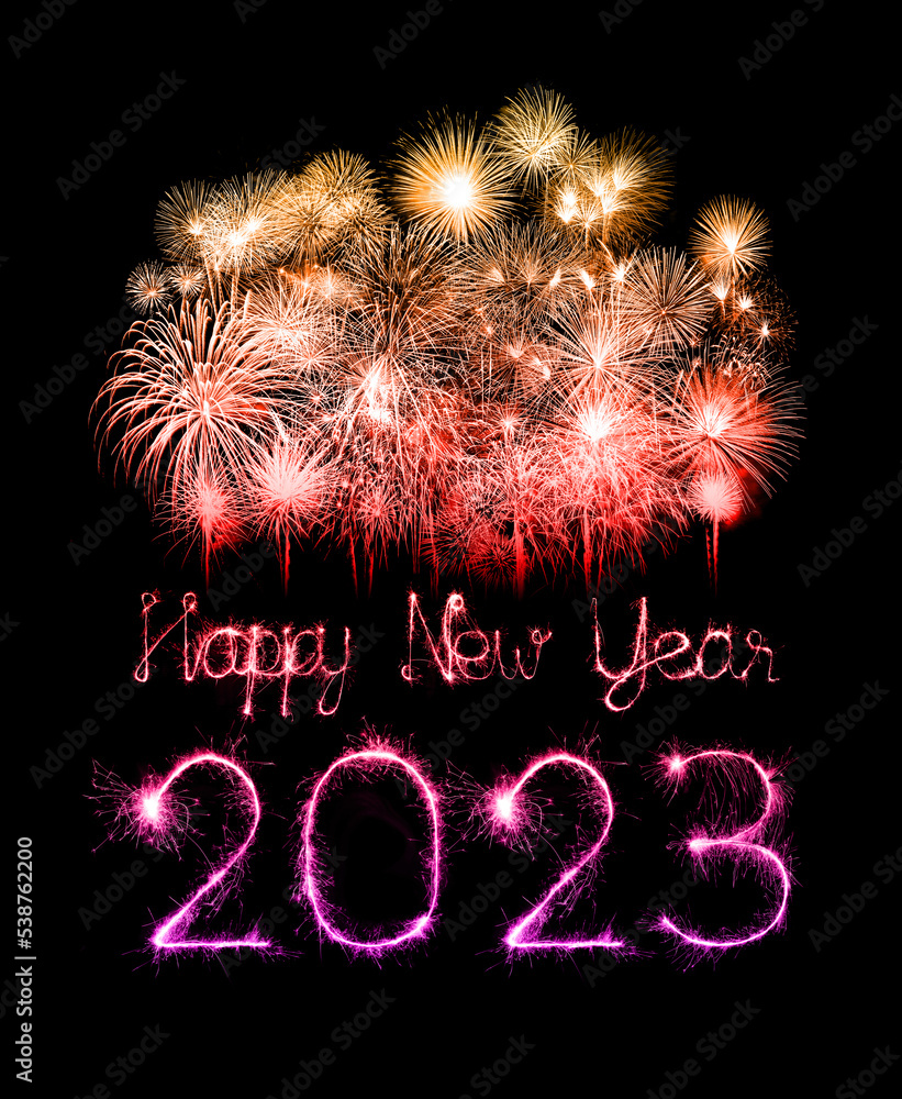 2023 happy new year fireworks celebration written sparkling at night.
