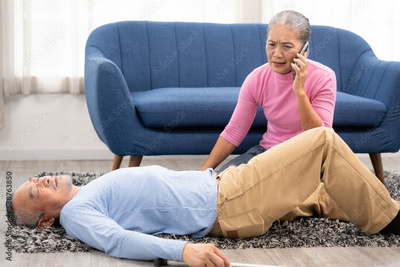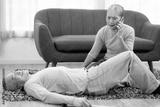 An elderly man falls unconscious in the house. An elderly woman calls for an emergency. Unconscious senior man with walking stick lying on carpet at home. selective focus