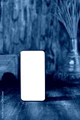 mockup blank screen mobile phone on wood table and decor with wicker decoration items