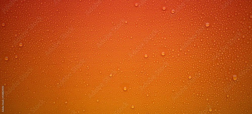 Dew drops on an orange rectangular background. Orange rectangular background with round raindrops