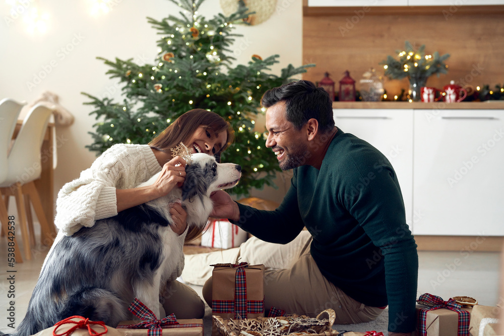 Multi ethnicity couple spending time with dog at Christmas
