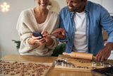 Close up of multi ethnicity couple making a gingerbreads and using mobile phone in Christmas time