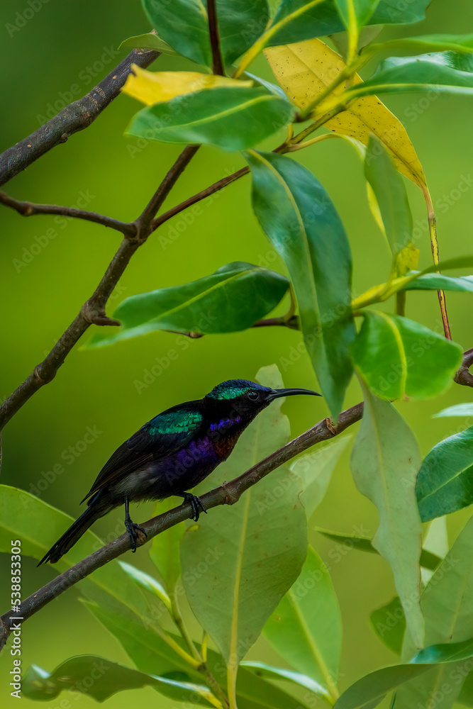 Male Copper-throated sunbird perching on the tree branch.
