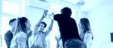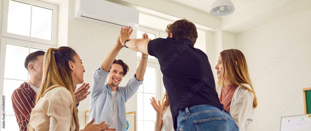 Team of school students achieving goal together. Group of happy cheerful joyful friends smiling and high fiving each other in classroom. Teamwork, education, success, fun concept. Banner background