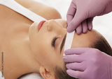 Hair removal, beauty and health concept. A young girl is getting an epilation procedure. A processional beauty worker is making depilation with hot wax.