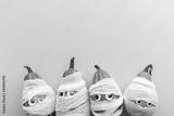 Hallowwen holiday background concept. Gourd pumpkins dressed as scary mummies with bandages and eyes