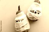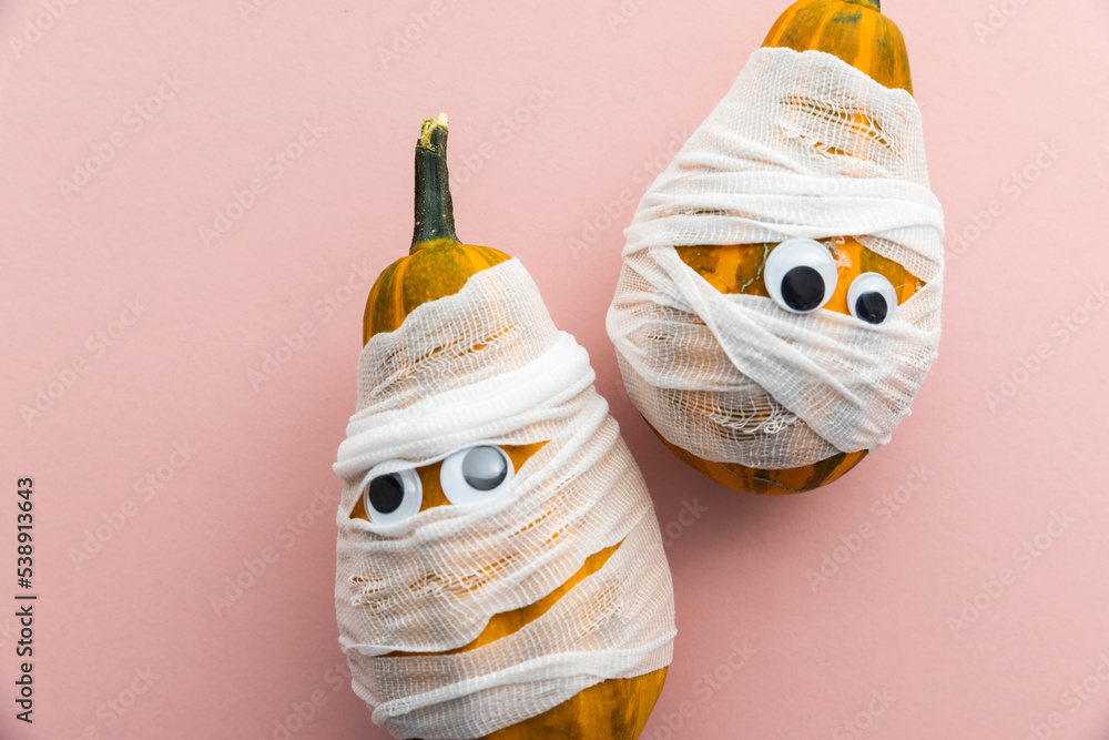 Hallowwen holiday background concept. Gourd pumpkins dressed as scary mummies with bandages and eyes