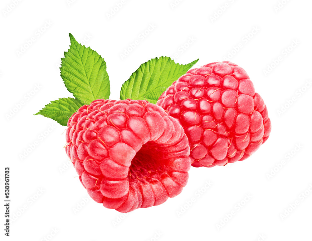 Raspberry berries isolated on white or transparent background. Two raspberry fruits with green leaves