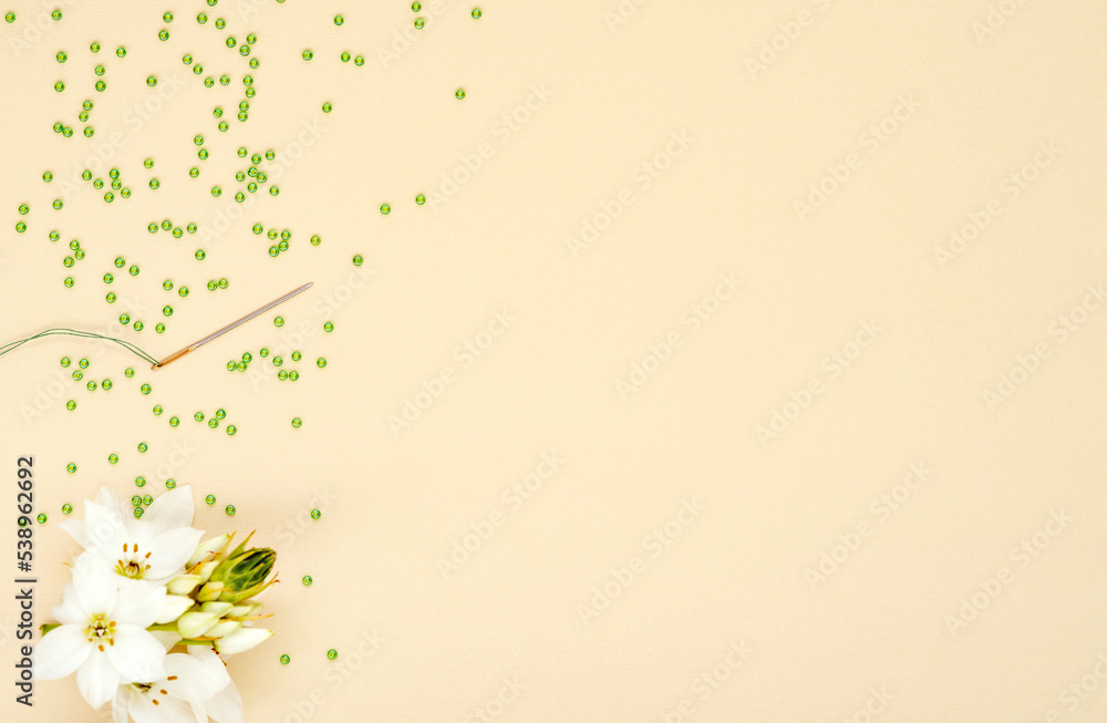 Hobby, craft, needlework or beading concept. Flat lay, top view. Creative minimalist background with space for text. Green glass beads, needle and thread decorated with white flower.