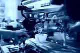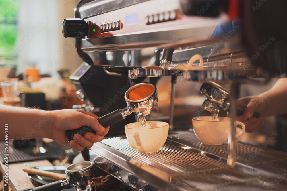 Close up of a hand holding a filter holder with ground coffee that already tamp an espresso machine or coffee machine in coffee shop. A professional barista. Concept of Preparing process of coffee.
