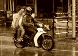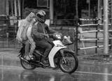 A moto taxi driver with a woman and a girl in a raincoat ride down the street in heavy rain