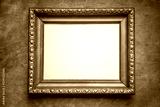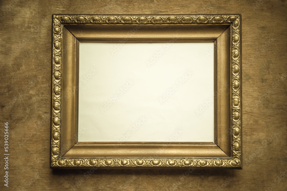 Antique gold frame on a wooden background in vintage style. A picture frame with an empty middle for a photo.