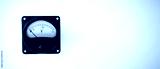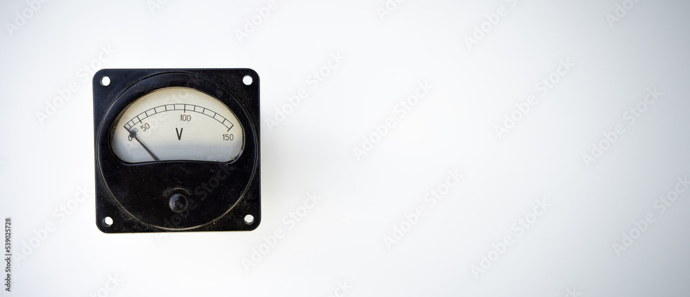 A black square device with a scale for measuring voltage on a white isolate. A device with glass for an electric panel on a white background. Measurement scale.