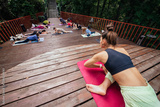 Group of young sporty people practicing yoga lesson with instructor,