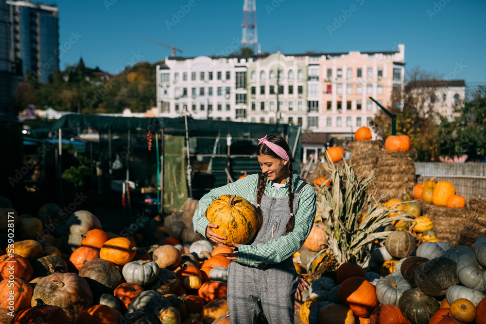Happy farmer woman in a denim jumpsuit holds ripe pumpkin