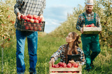 Front view 3 farmers men picking apples put them in a box, a woman examines and writes in a notebook. The family business is flourishing. It's harvest time. Woman checks each apple for quality.