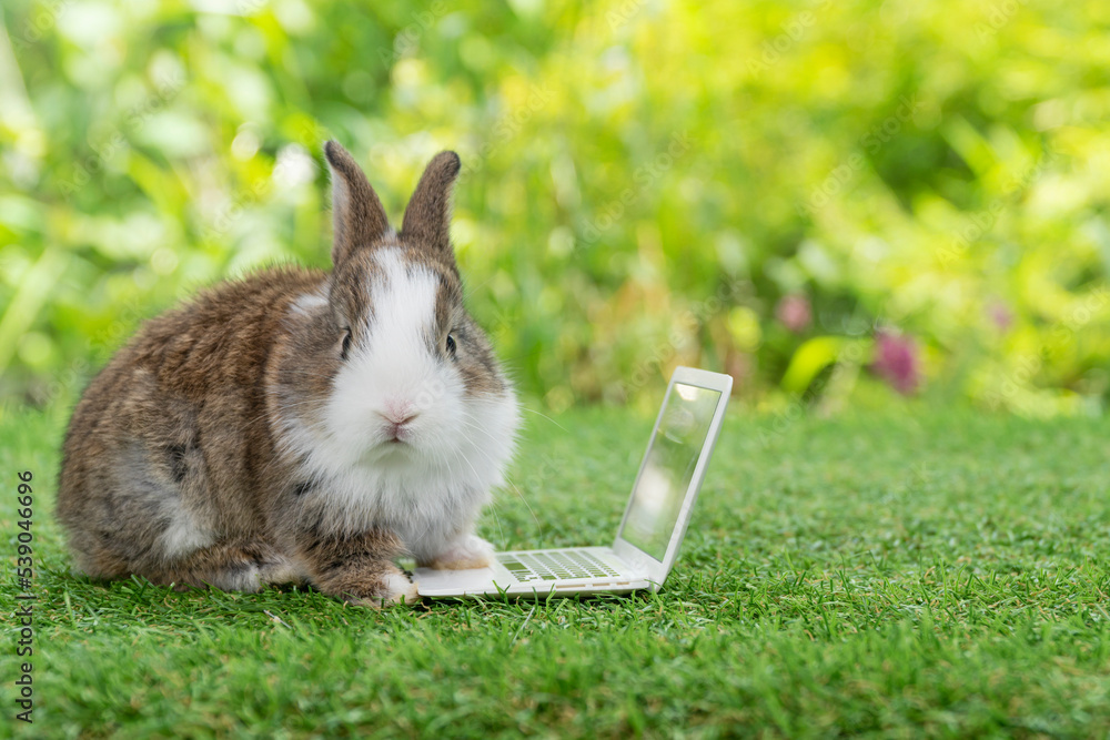 Adorable baby rabbit bunny with small laptop sitting on the green grass. Lovely infant rabbit white brown bunny looking at notebook screen on lawn natural background. Easter fluffy animal pet concept.