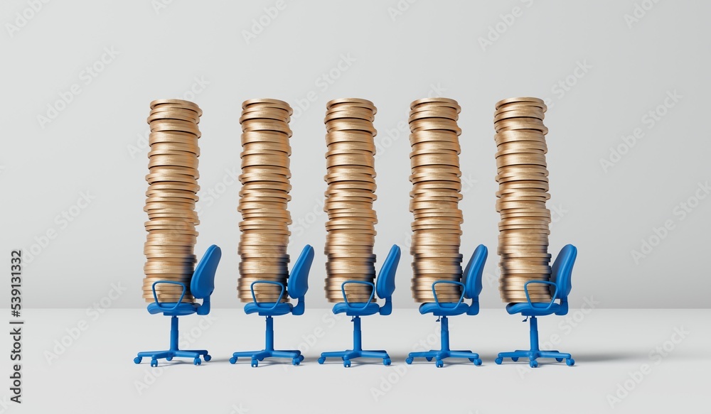 Office chair with a stack of coins. Career promotion wages and salary concept. 3D Rendering