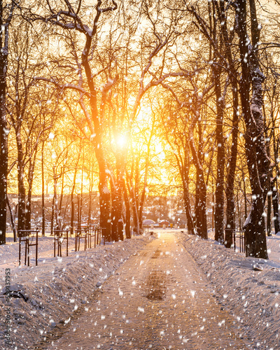 Sunset or dawn in a winter city park with trees, benches and sidewalks covered with snow and ice. Falling snow.