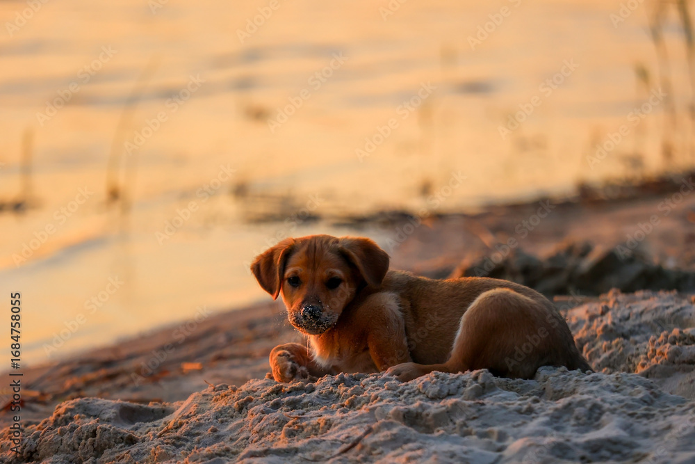 Pomeranian in a yellow hat and sweater sits near the fireplace