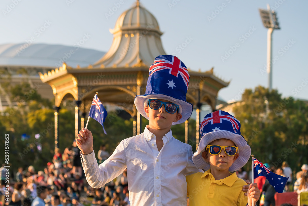 Two happy Australian boys celebrating Australia Day in Adelaide city