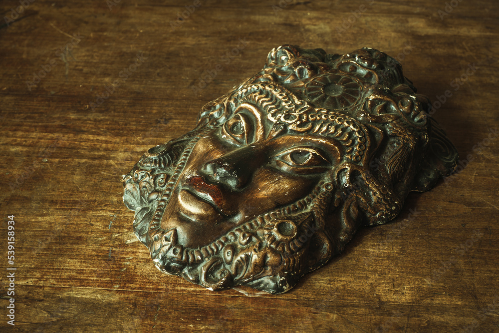 African clay mask of a woman on a wooden table. A souvenir from Africa. Brown woman mask for wall decoration.