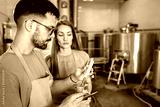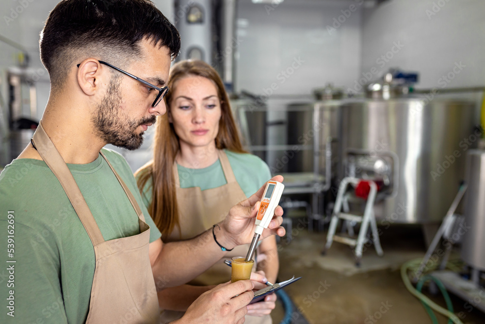 Man and woman working in craft brewery checking the pH value of the beer.