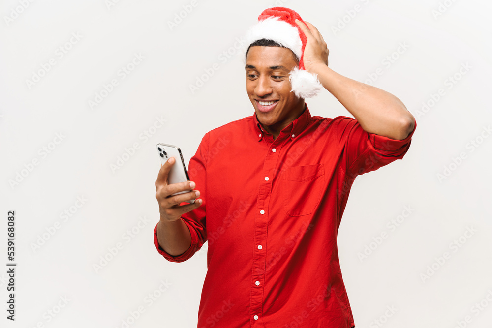 Wondered happy young man wearing santa hat look at smartphone and holding head surprised, isolated on white background. African man received New Year gift, party invitation. Advertising concept