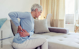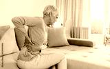 Cropped image of senior woman suffering from backache in morning sitting on bed, free space. Lower back pain in elderly person.