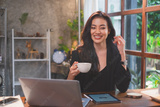 An asian female freelance or Businesswoman is smiling while holding a cup of coffee with cheerful, enjoy, laughing, motivation and happy feeling. An achitect work in cafes.