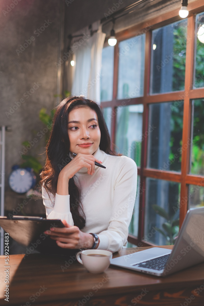 Female consultant is having a motivation for work in the cafe with a cup of coffee while using notebook or laptop in coffee shop with relaxing moment. Female entrepreneur working in cafes.