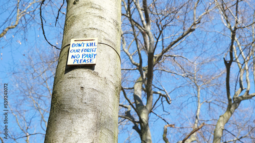 "Don`t kill our forests - no party please" sign on a tree in a forest near Berlin. Call to preserve nature.