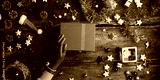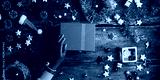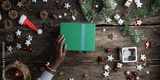 Hand of black coloured girl holding a green holiday gift box on a rustic wooden desk festively decorated with christmas ornaments