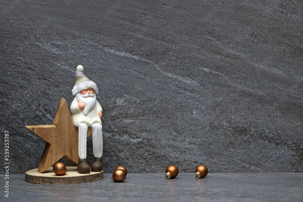 Christmas background: Santa Claus sitting on a star with Christmas balls and space for text.