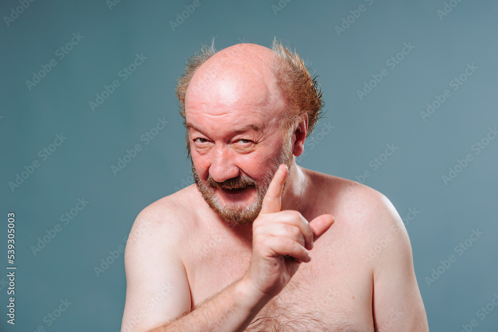 Front view a man isolated in the studio, looking into the camera with his head slightly tilted, smiling, pointing index finger. Sign silent with index finger grinning. Studio isolated blue background.