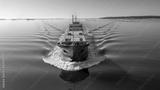 Aerial forward view of general cargo vessel making way ahead in Finnish archipelago during spring time. Glassy sea surface.