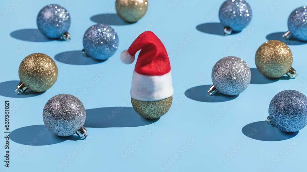 Merry Christmas. Red Santa hat on a silver ball. Blue background of sparkling Christmas balls.