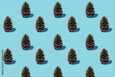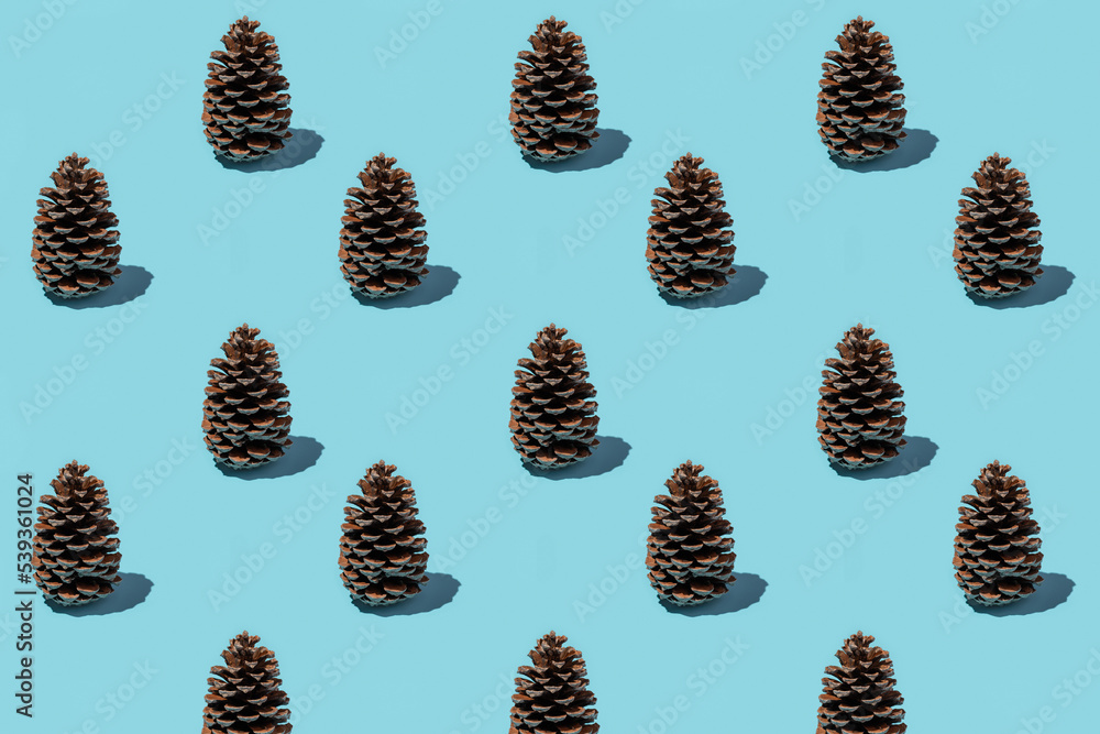 Background Christmas pattern. Cloned pine cone on a blue background.