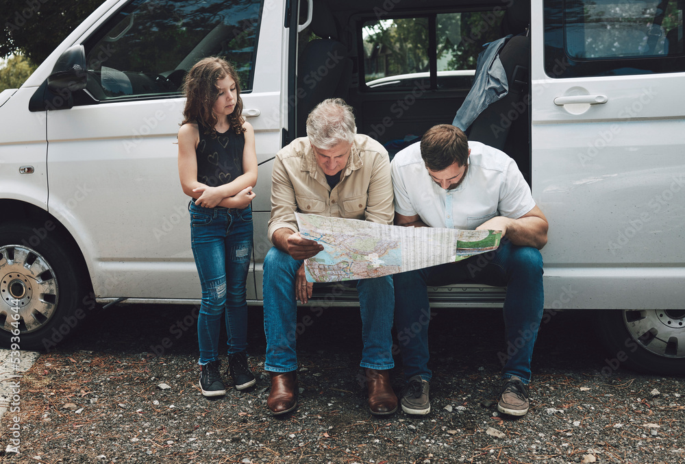 Travel, car and family with map for direction, transportation support and planning course journey on Canada road trip. Kid girl, grandpa, dad on auto SUV van, vacation and lost driver search for way