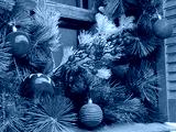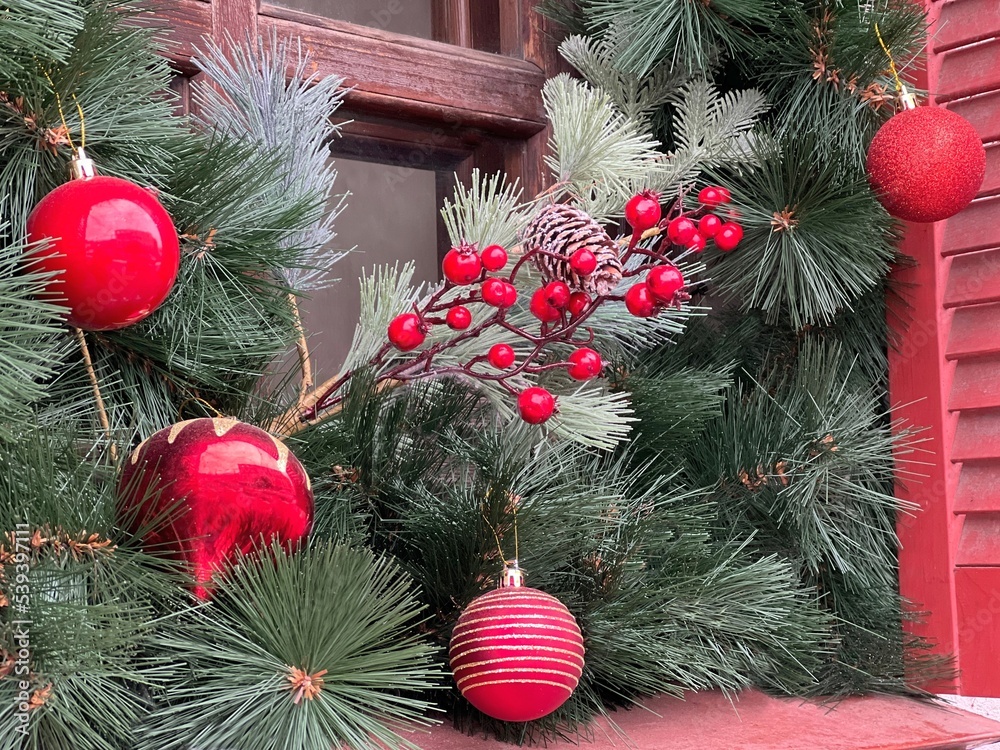 Christmas tree decorations shiny balls, pine branches, red berries in the window.