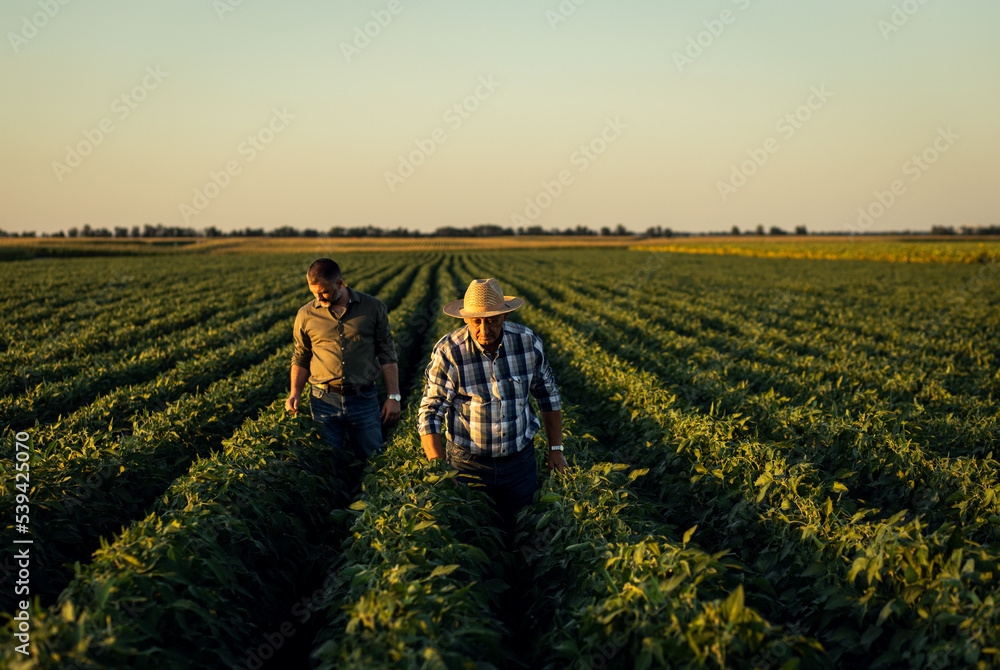 Two farmers in a field examining soy crop at sunset.