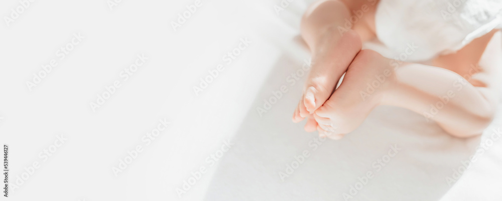 Baby in a diaper lies on a white bed. top view. copy space