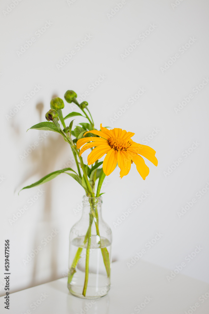 Mexican sunflowers vase. White background. Spring composition