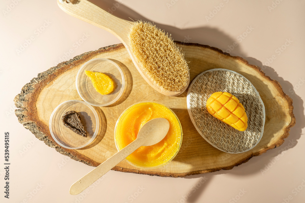 A body care brush, a massager, a natural mango soap and a bath bomb for spa procedures lying on a wooden plate