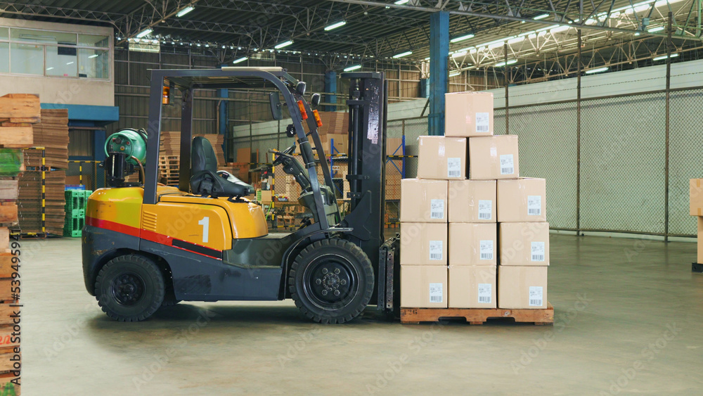 Side view of a forklift with stacked cargo cardboard boxes on wooden pallet in a large warehouse waiting for transportation by container trucks, ships, or planes. A lot of boxes with barcodes to tag a