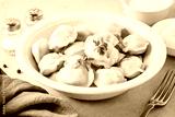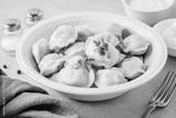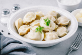 Dumplings. Meat stuffed Dumplings in a bowl on gray stone background.
