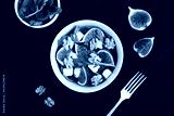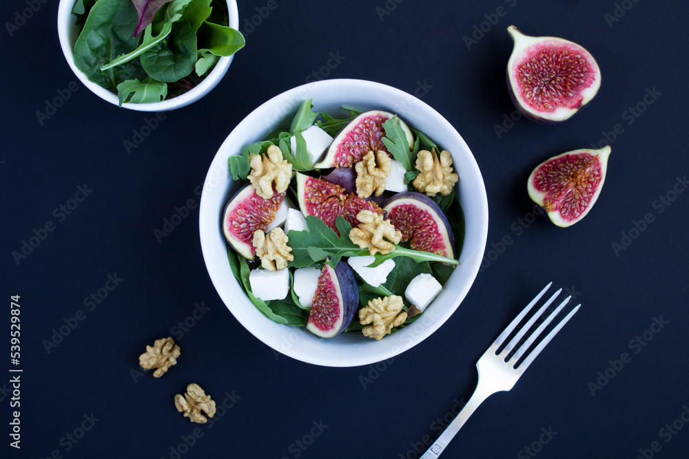 Salad with arugula, feta cheese, figs and walnuts in the white bowl on the black background. Top view. Close-up.