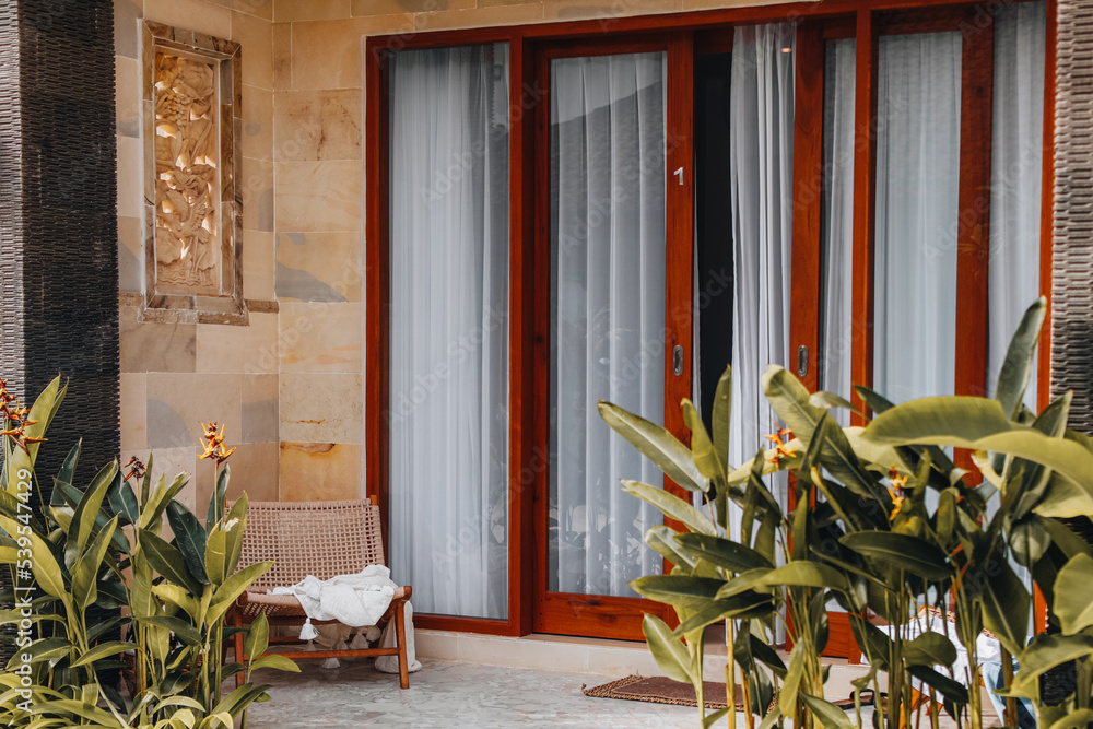 Cozy summer veranda with tropical plants and wicker chair.