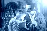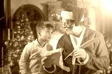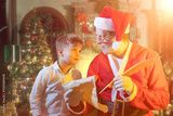 Santa Claus and a little boy. Kid boy tells wishes in front of Christmas Tree